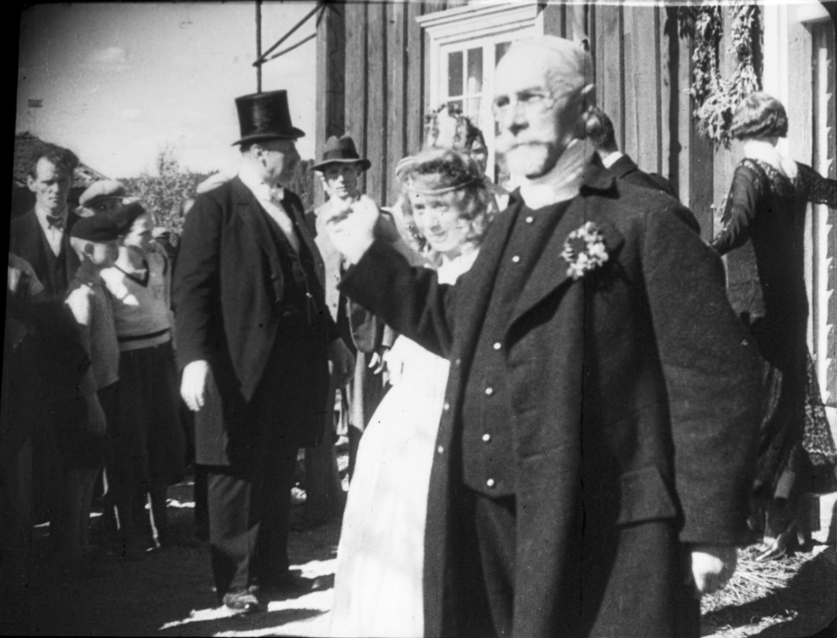 Brudfölje: Bruden föres av gammelfar i spetsen för hela bröllopsskaran på väg runt majstången till dansbanan. Ärtemark