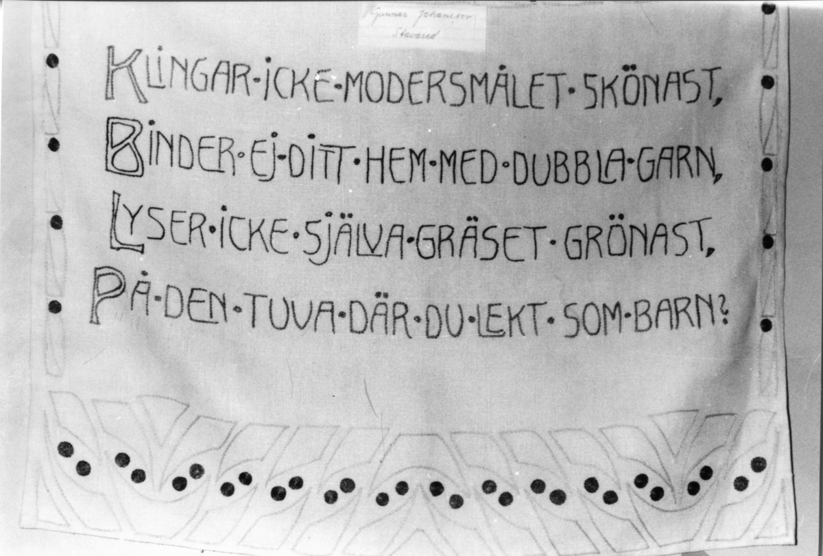 Väggbonad från Tvärred vid hembygdsföreningens utställning omkr. 1975. Ägare (ev. sömmare) Gunnar Johansson, Stavared.