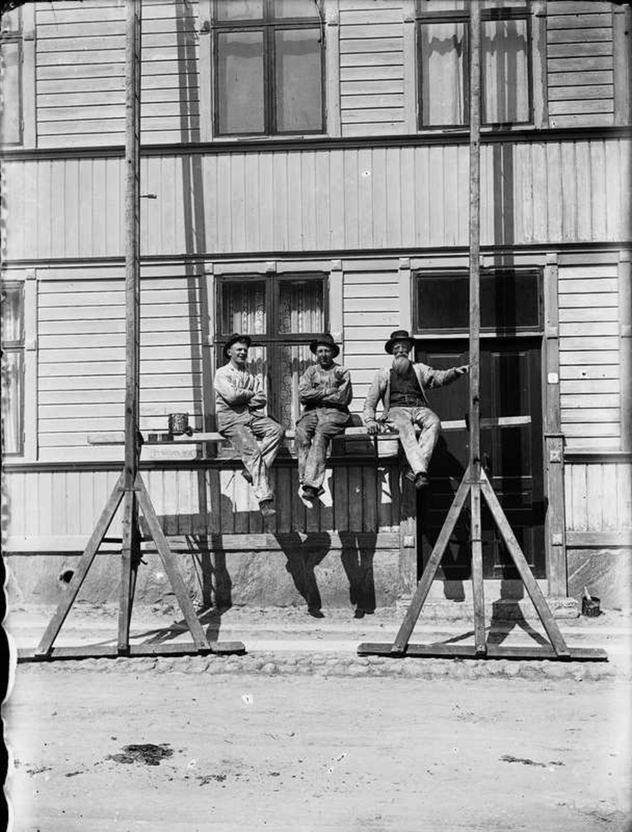Tre personer på ställning, målar hus. Gatuadressen okänd men Nr 4 är siffran på porten.