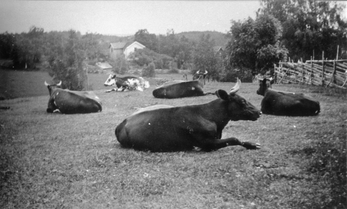Gärdets kor i Vasared. I bakgrunden Vaslings hus. Ca 1930-talet. Förr var det fler betesdjur i Tvärred än det fanns människor.
