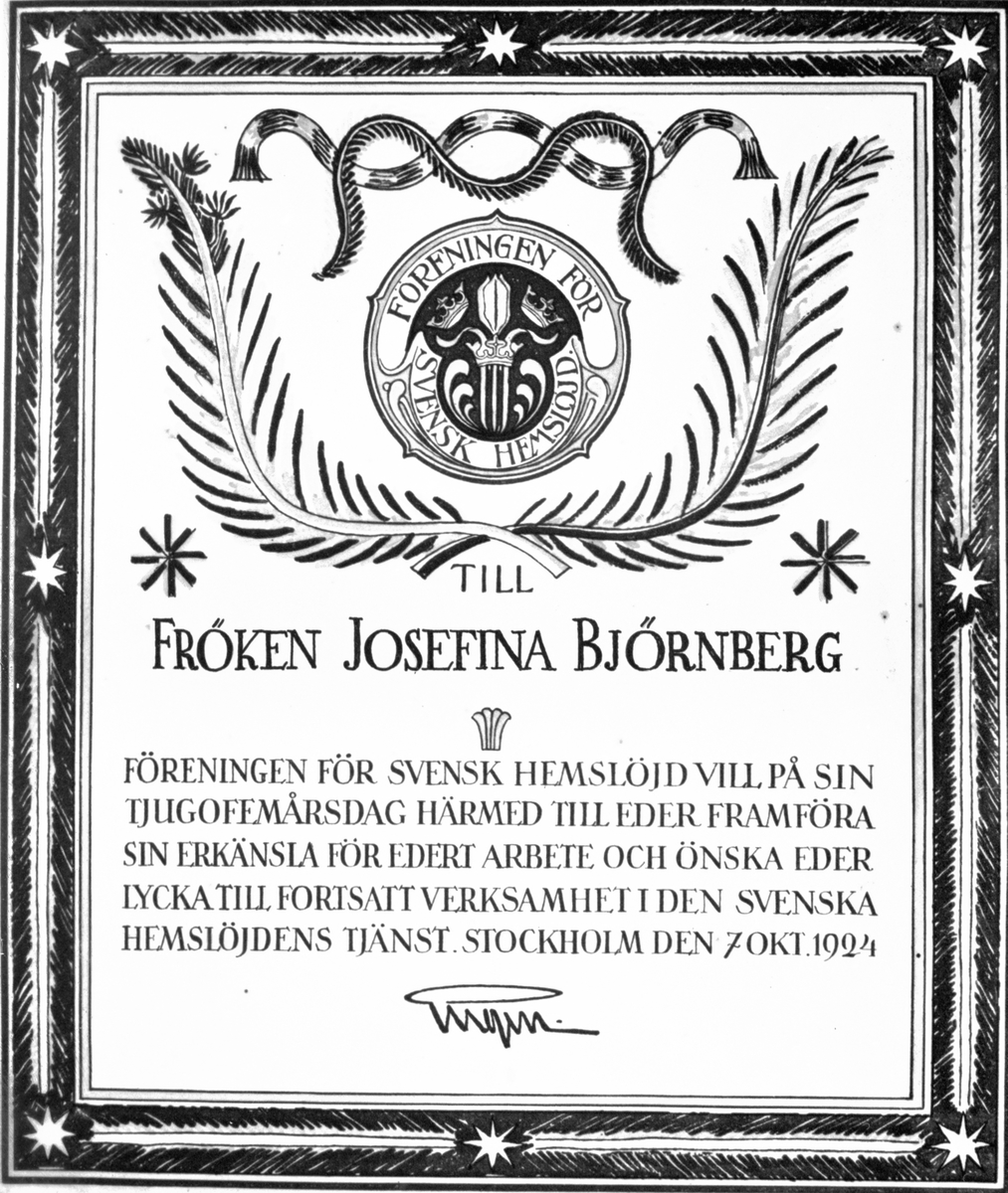 Josefina Björnberg Diplom från Föreningen för svensk hemslöjd. Stora Mellby