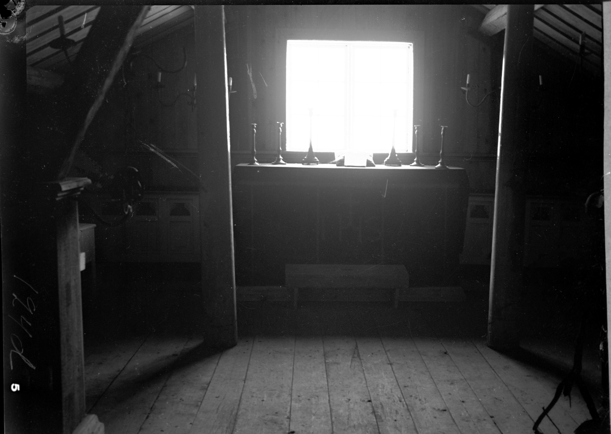 Västra Tunhem. Gamla föremål från kyrkan samlade i ett magasin i prästgården.