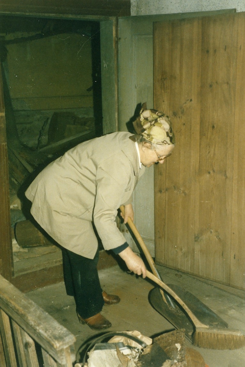 En äldre kvinna sopar golvet med en kvast. Före renovering? Stegerhult Liared