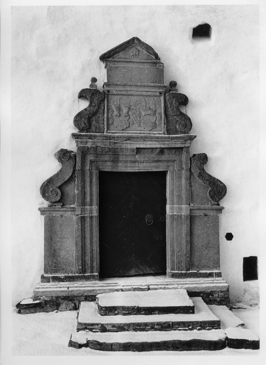 Exteriör. Port. Torpa stenhus Länghem är en så kallad enkelhusborg från 1400-talet och är mest känd som sätesgård för släkten Stenbock.