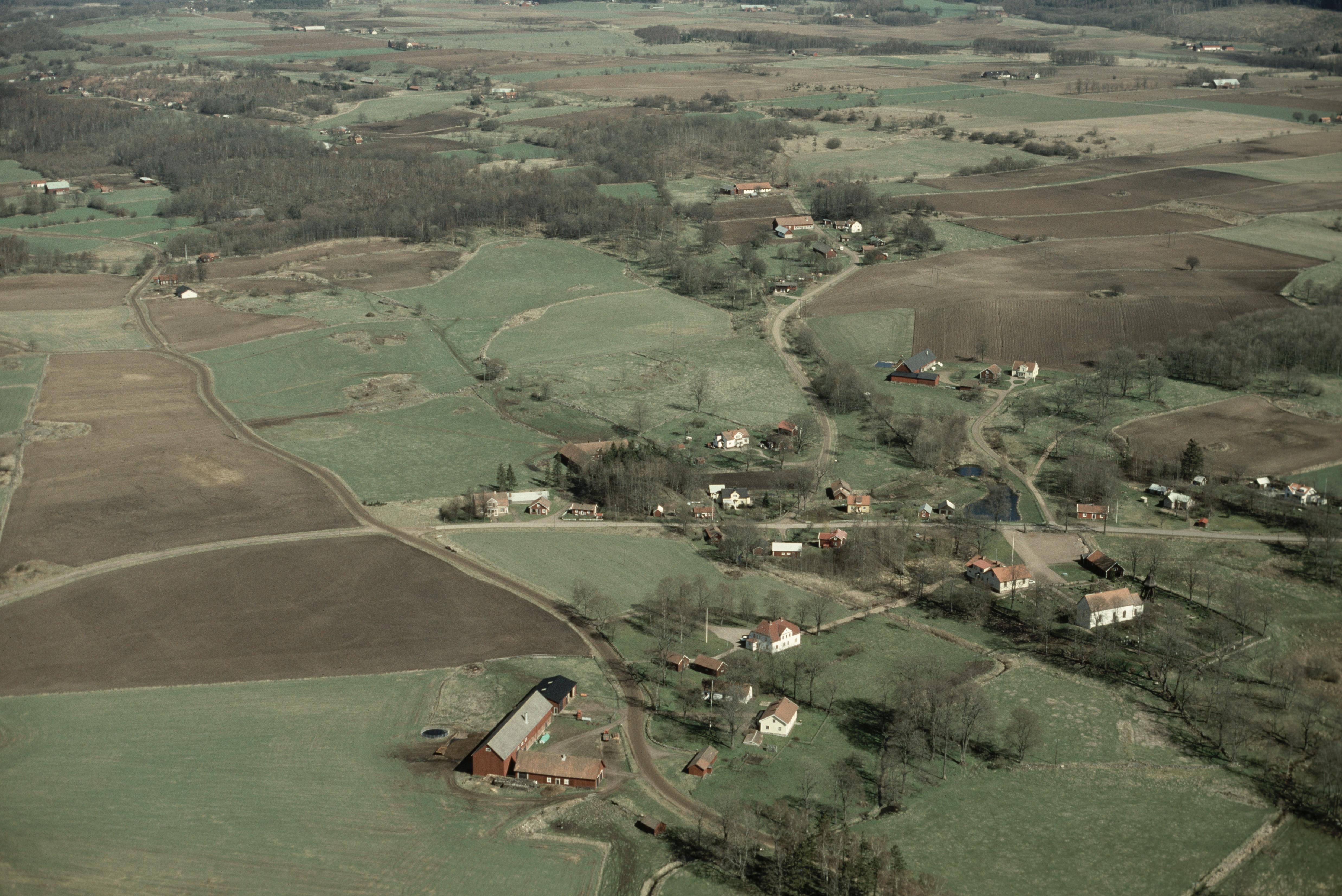 Gökhems kyrka och kyrkby. I bildens övre del socknet Vilske-Kleva. Bilden är tagen mot (väderstreck): NNO
