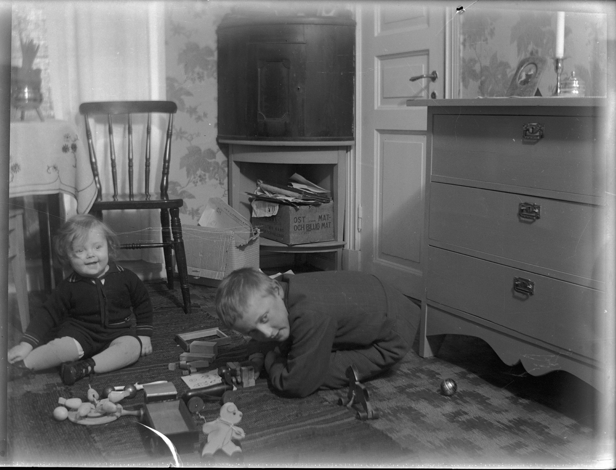 Interiör (blixtljus). Gunnar och Per leka i sängkammaren.