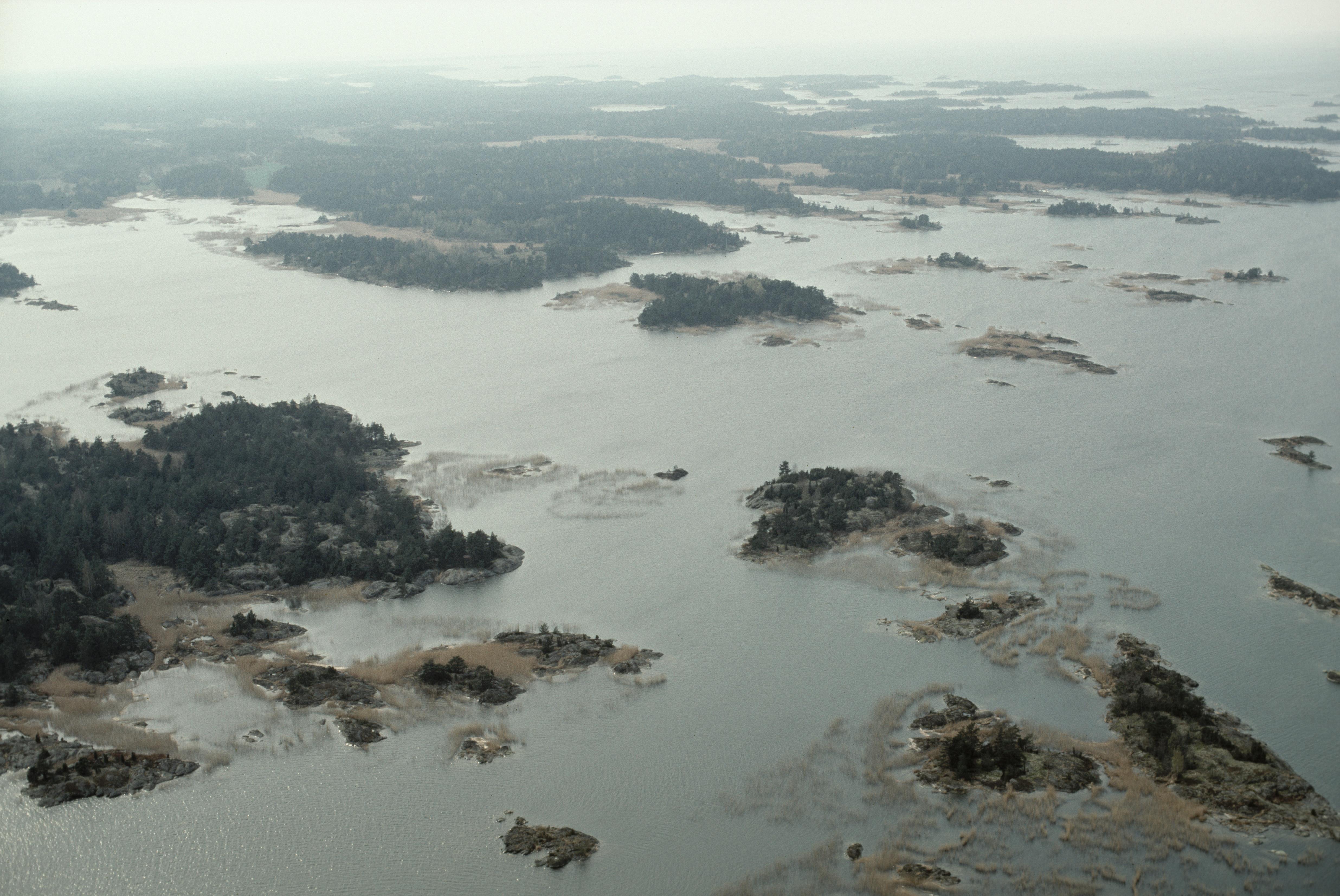 Ekens skärgård i sjön Vänern. Fornlämningsmiljö med spridda bronsåldersrösen, bl.a. röse RAÄnr Otterstad 87:1 på Pirum uppe till vänster. Billingsön nere till vänster. Bilden är tagen mot (väderstreck): S