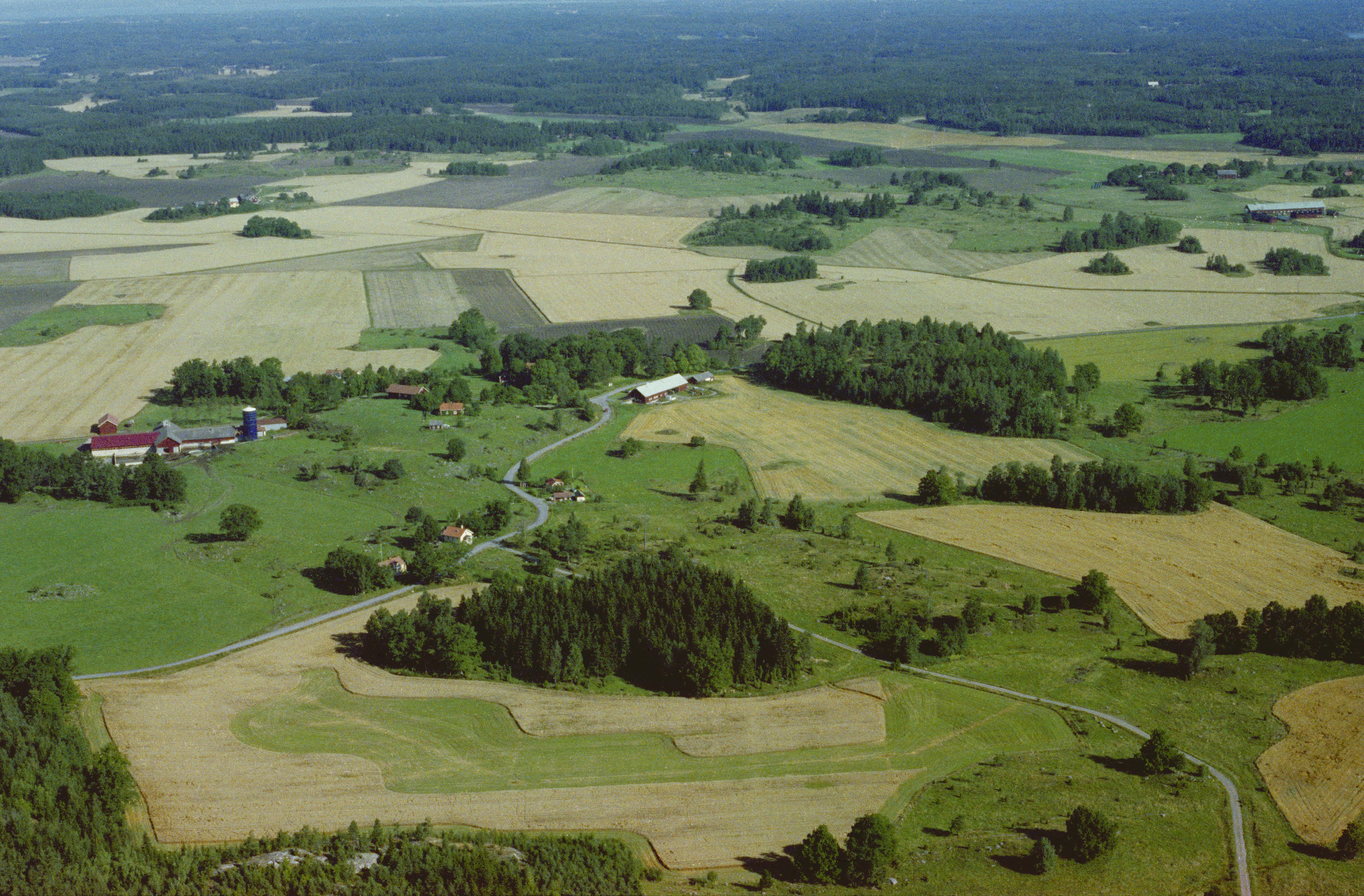 Åkerby sydost om Gårdeby kyrkby. Prästgård och gravfält RAÄnr Gårdeby 14:1 vid bildens mitt. Gårdeby kyrkby i bildens övre del till höger. Bilden är tagen mot (väderstreck): NNV