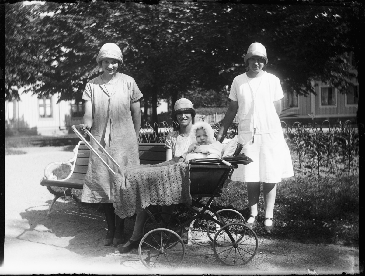 Flickorna på promenad med barnvagn i parken. (Elsa, Märta m.fl.)