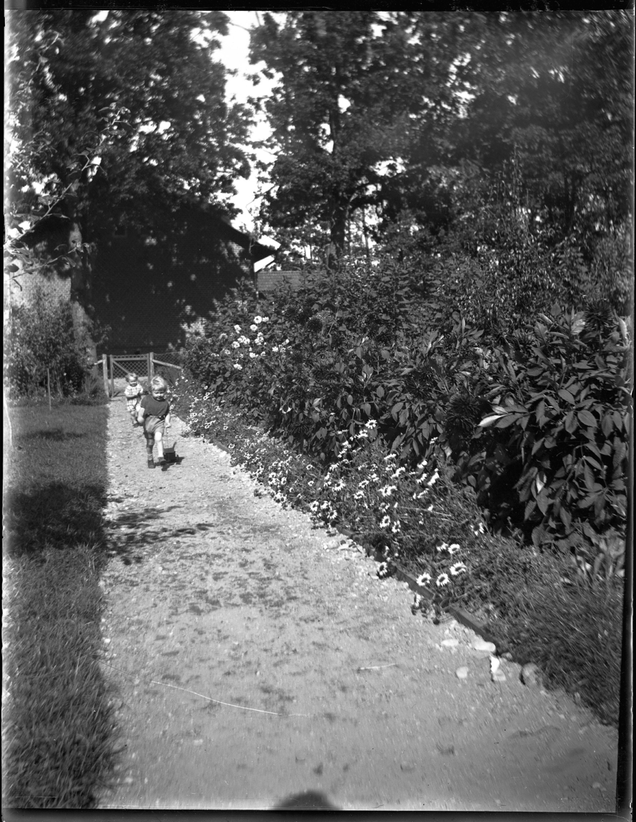 Sommarbild i trädgården: Gunnar och Bengt-Ola komma springande på trädgårdgången.