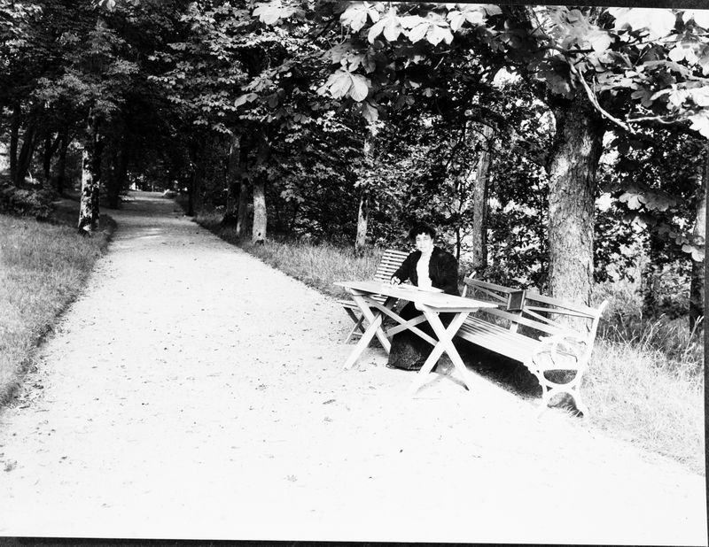 Nääs. Sophie Elkan sittande i parken sensommaren 1914