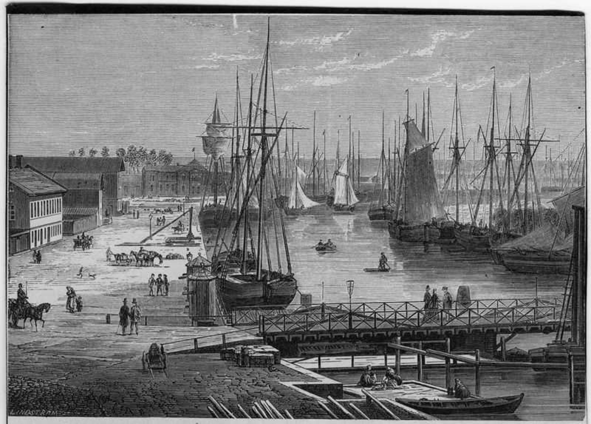Ur ny illustrerad tidning, staden Vänersborg sedd från hamnen (Vassbotten)