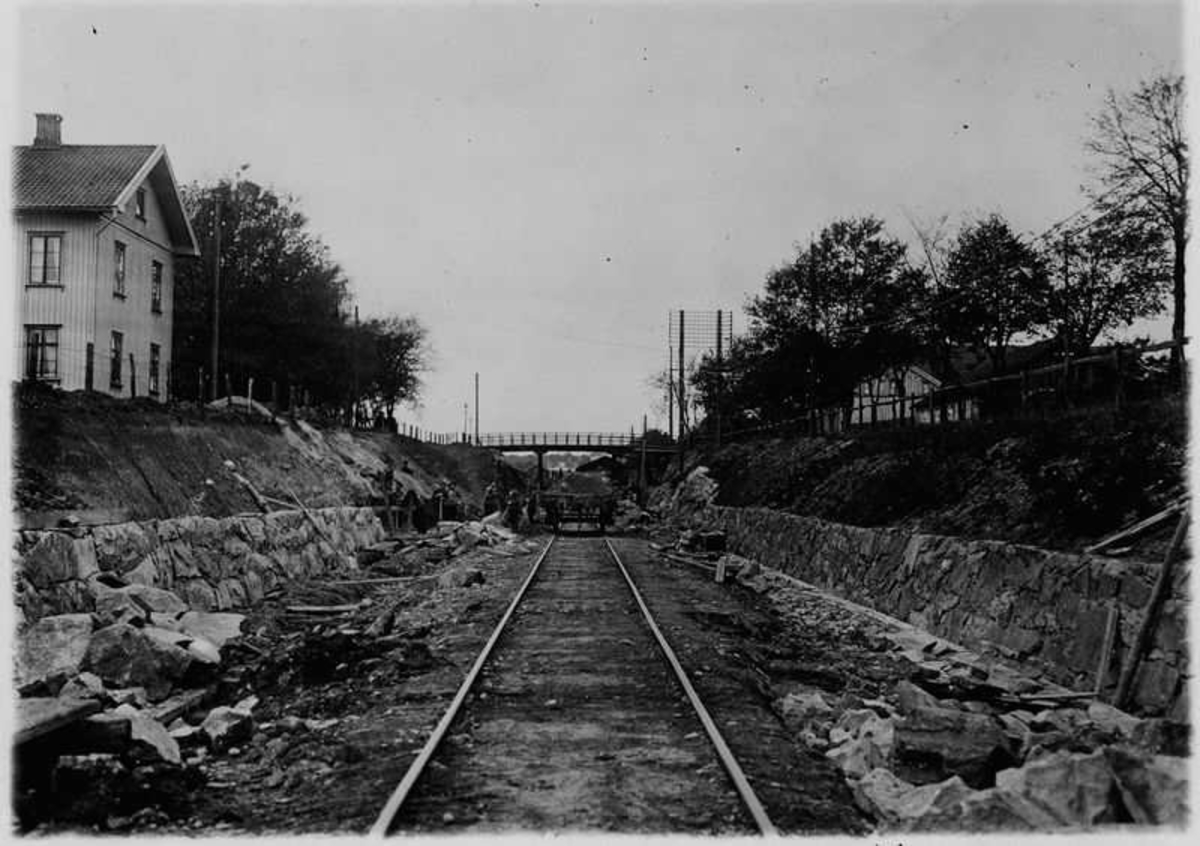 Järnvägen under omläggning med bron vid Edsgatan i bakgrunden och Norra Järnvägsgatan trädbevuxen Järnvägsområdet Väneersborg