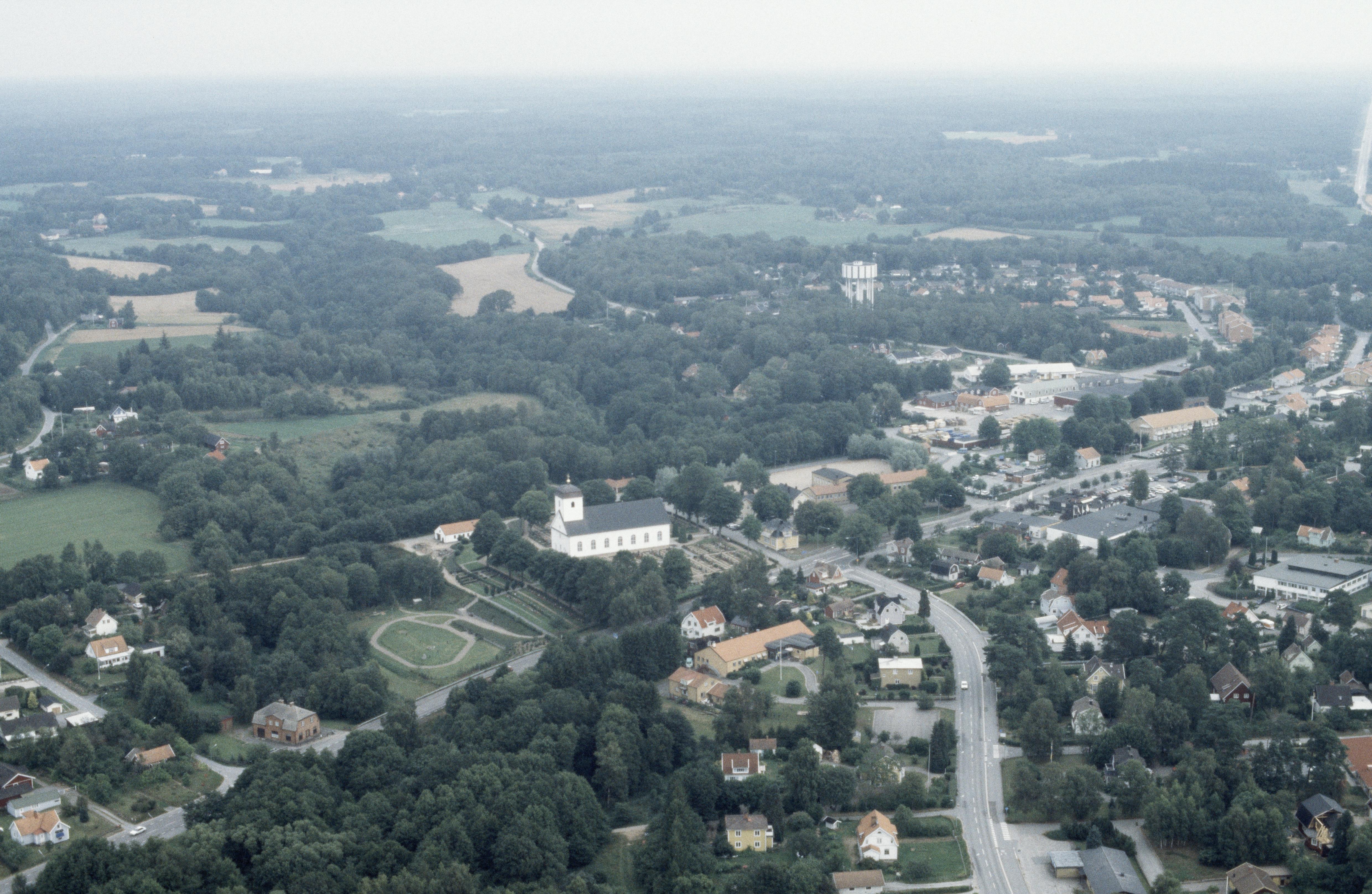 Jämjö tätort. Jämjö kyrka vid bildens mitt. Bilden är tagen mot (väderstreck): NO