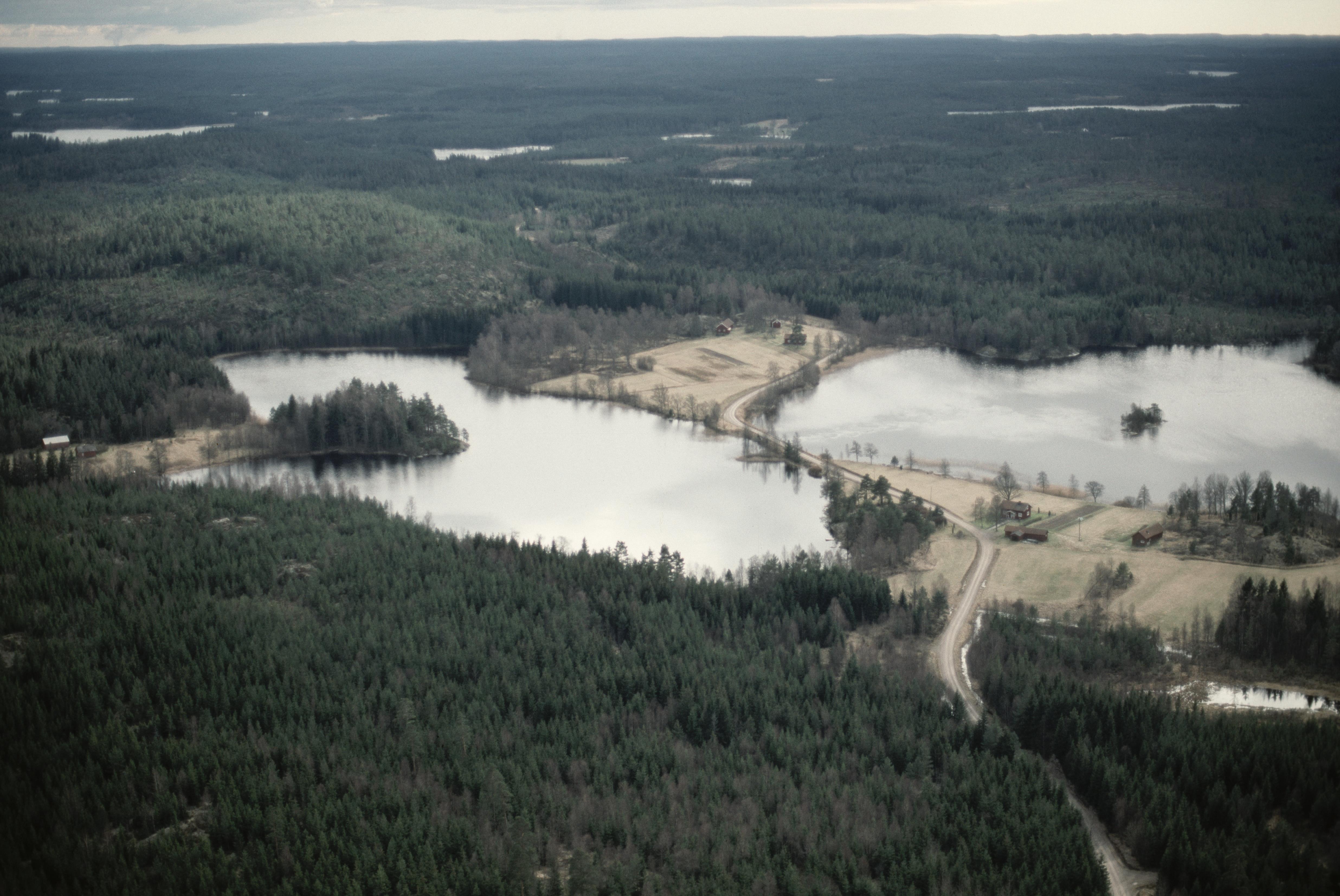 Torpmiljö vid Södra Kornsjön. Torpet Holmen i bildens nedre del, vid bildens mitt torpet Gräsön på Flötemarksön. Husgrund RAÄnr Naverstad 145:1 i bildens övre del. Bilden är tagen mot (väderstreck): SSV