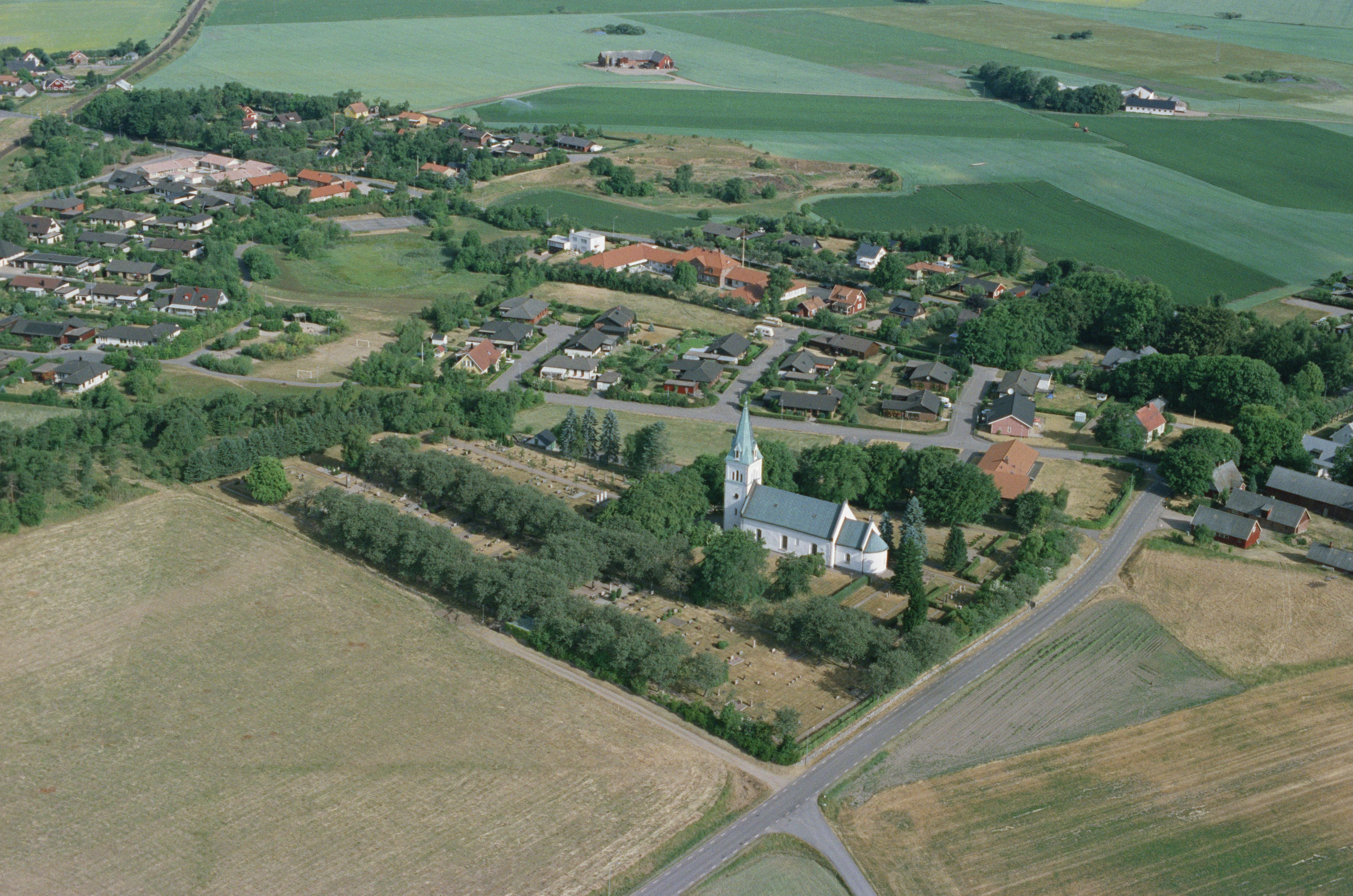 Eldsberga kyrka och kyrkby. Bilden är tagen mot (väderstreck): NV