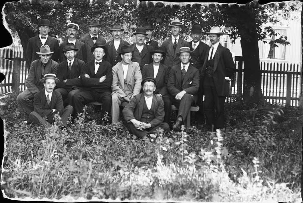 En grupp män blir fotograferade i en trädgård. Möjligen i Vänersborg.