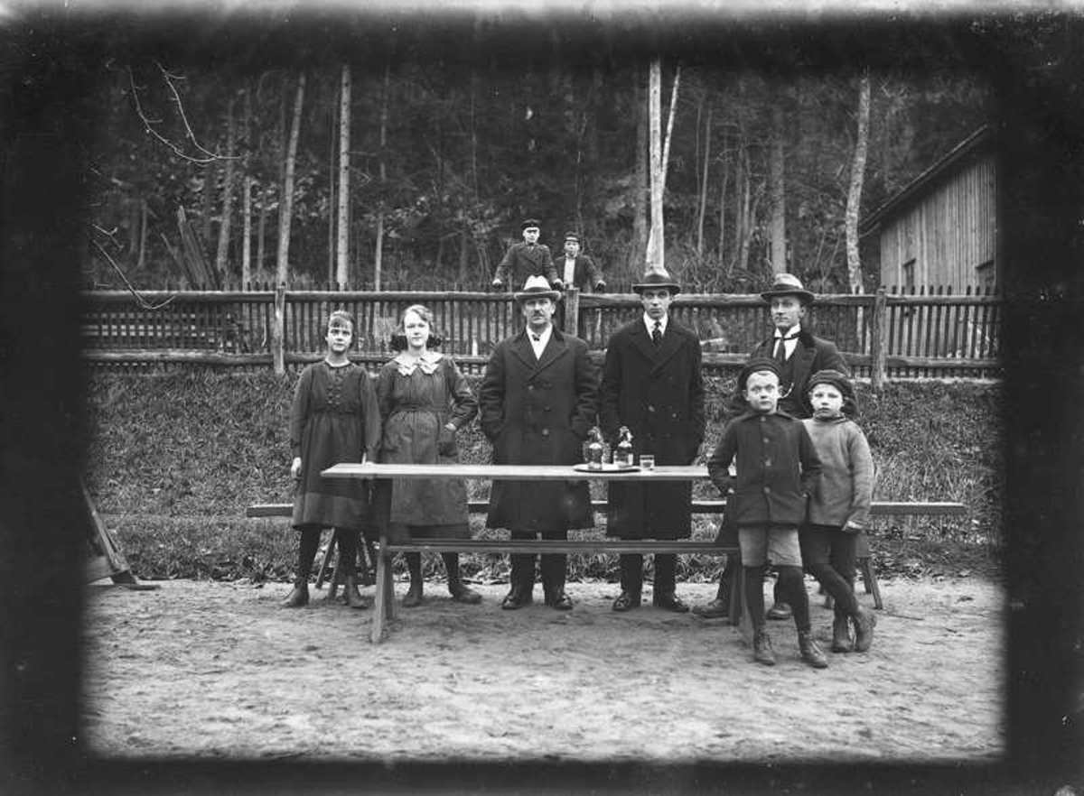 Sju personer står runt ett bord, ytterligare två står i bakgrunden.