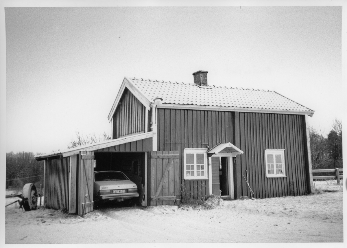 Hus och garage med bil. Snö. Björdal Månstad E 281. 378.