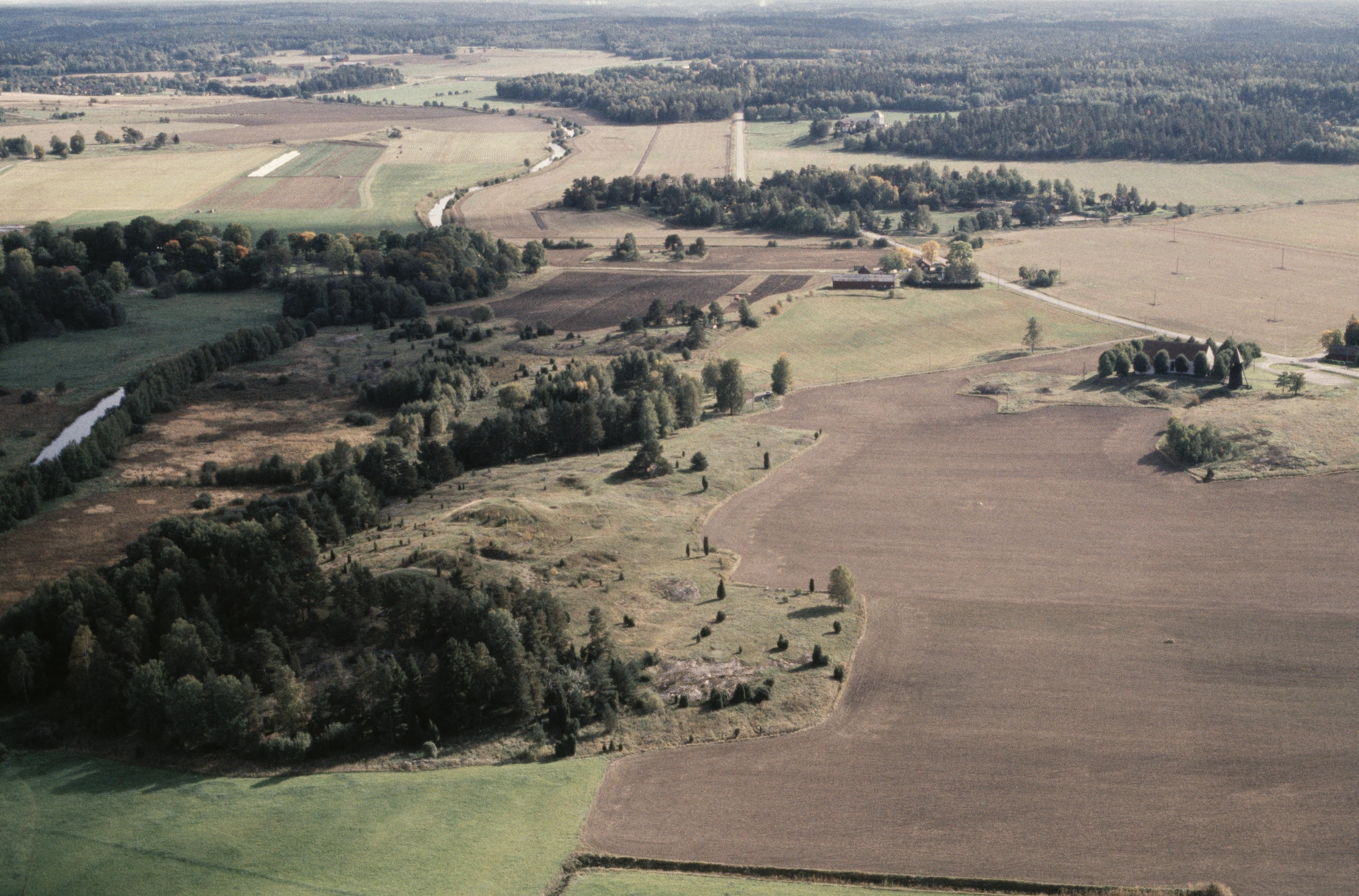 Vid Helgöån / Husaån i Långhundraleden. Gravfältet Sjökullarna RAÄnr Vada 10:1 och Vada kyrka. Bilden är tagen mot (väderstreck): S