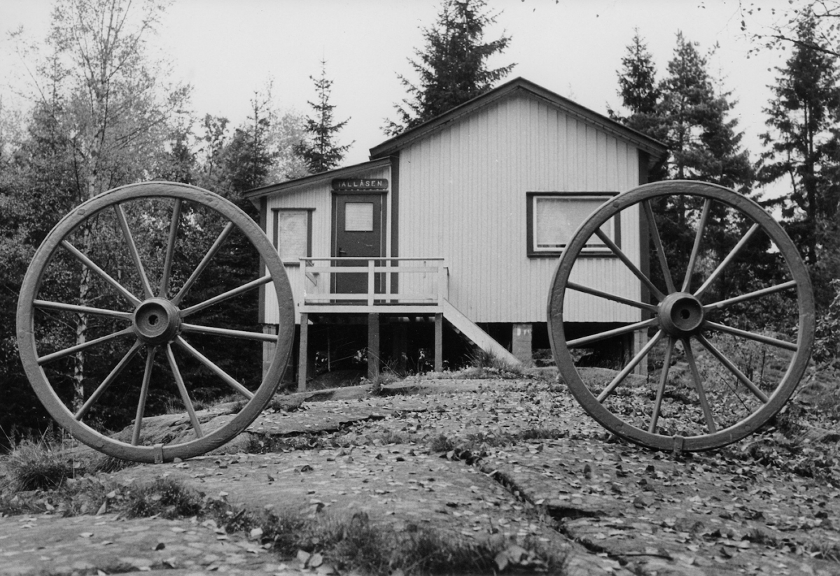 Trähus. Två vagnshjul fastsatt i marken. Lerum