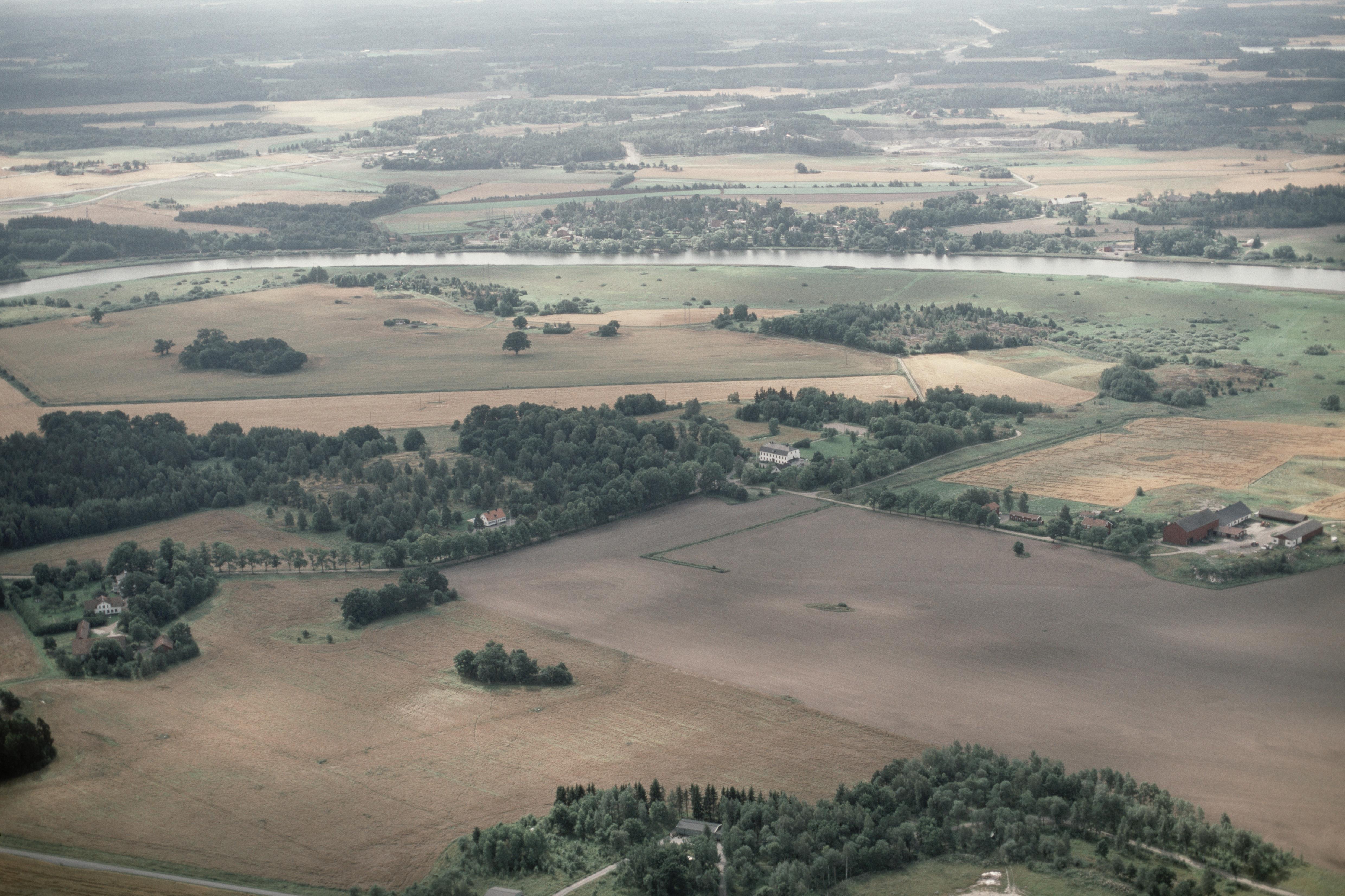 (Tid. Östra Eneby socken). Hällristningar RAÄnr Östra Eneby 23:1, 29:1-3, 77:1-3, 156:1 m.fl. Nere till vänster gården Ekenberg och till höger Leonardsbergs herrgård. Motala ström i bildens övre del. Bilden är tagen mot (väderstreck): S