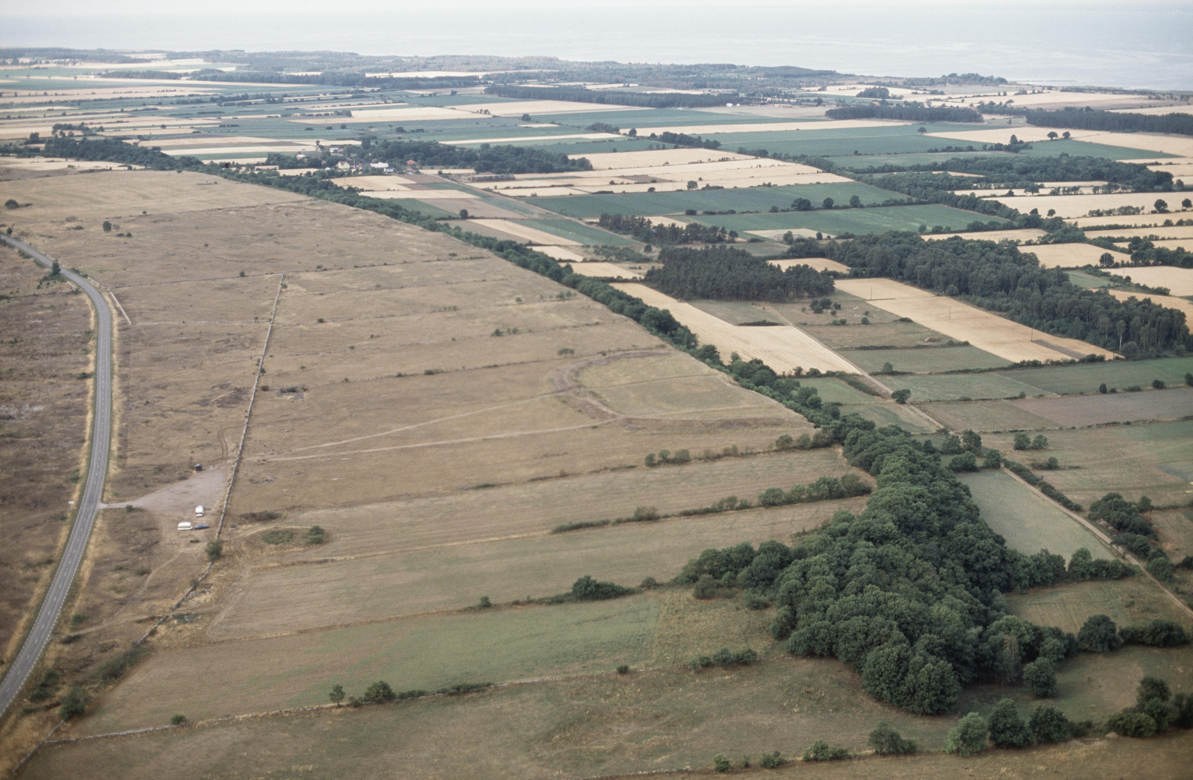 Alvaret. Fornborg Bårbyborg / Bårby borg RAÄnr Mörbylånga 17:1 vid bildens mitt. I bildens övre del byarna Beteby och Risinge. Bilden är tagen mot (väderstreck): SV