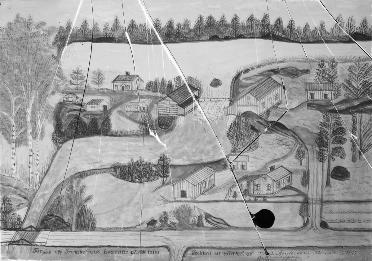 Torsbo och Trombäljens, kvarnarna på 1880-talet. Frändefors. Teckning ur minnet, gjord av Joel Andersson, Lönnebergshage i december 1947.