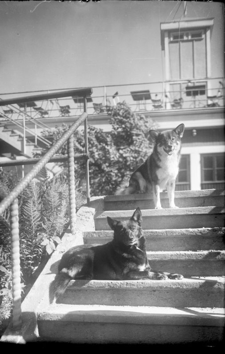 Två hundar på trappan till Folkets Park, serveringen. Vänersborg