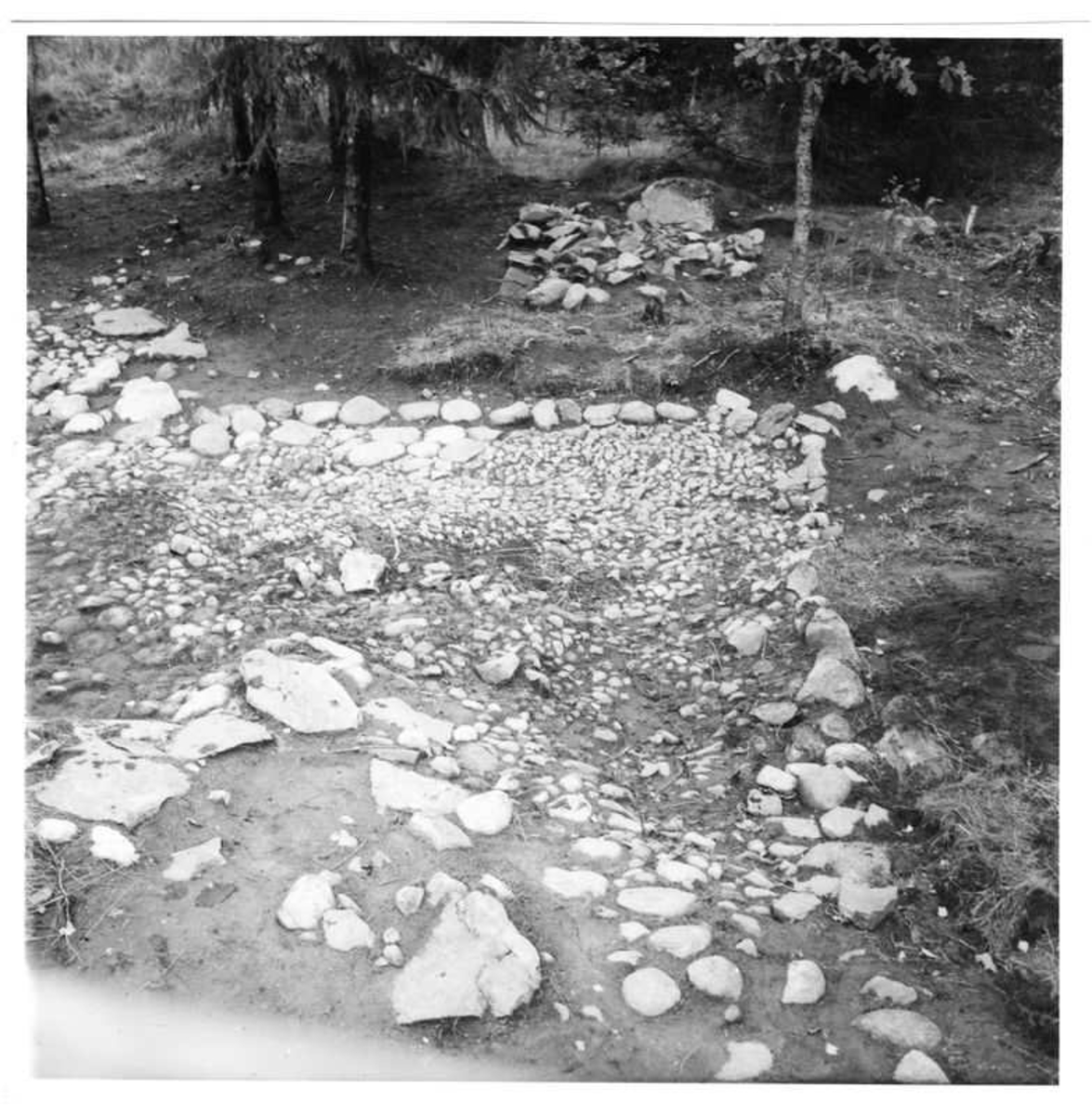 Utgrävning. Gata och i fonden spiselgrund. Brätte Vassända-Naglum