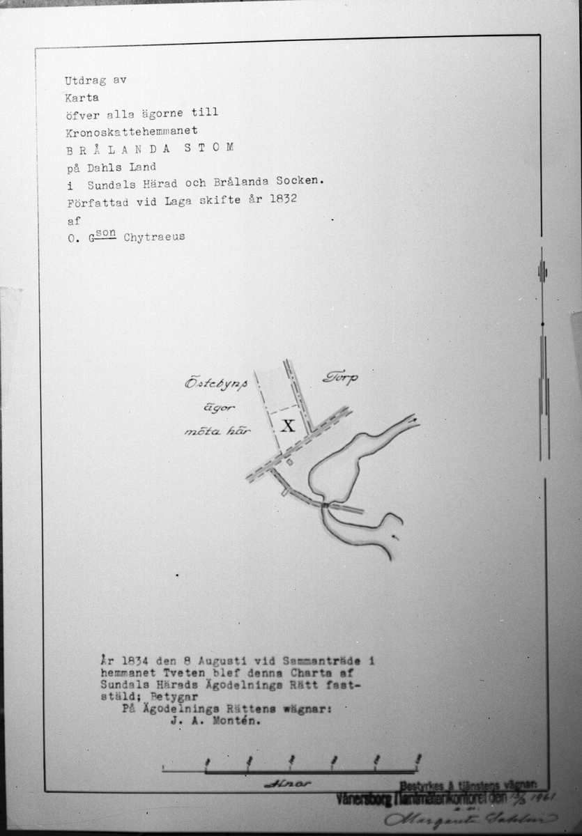 Utdrag av karta över alla ägare till Kronoskattehemmet på Dalsland i Brålanda och Sundals Ryrs socken författad vid laga skifte år 1832 av O Gson Chytraeus.