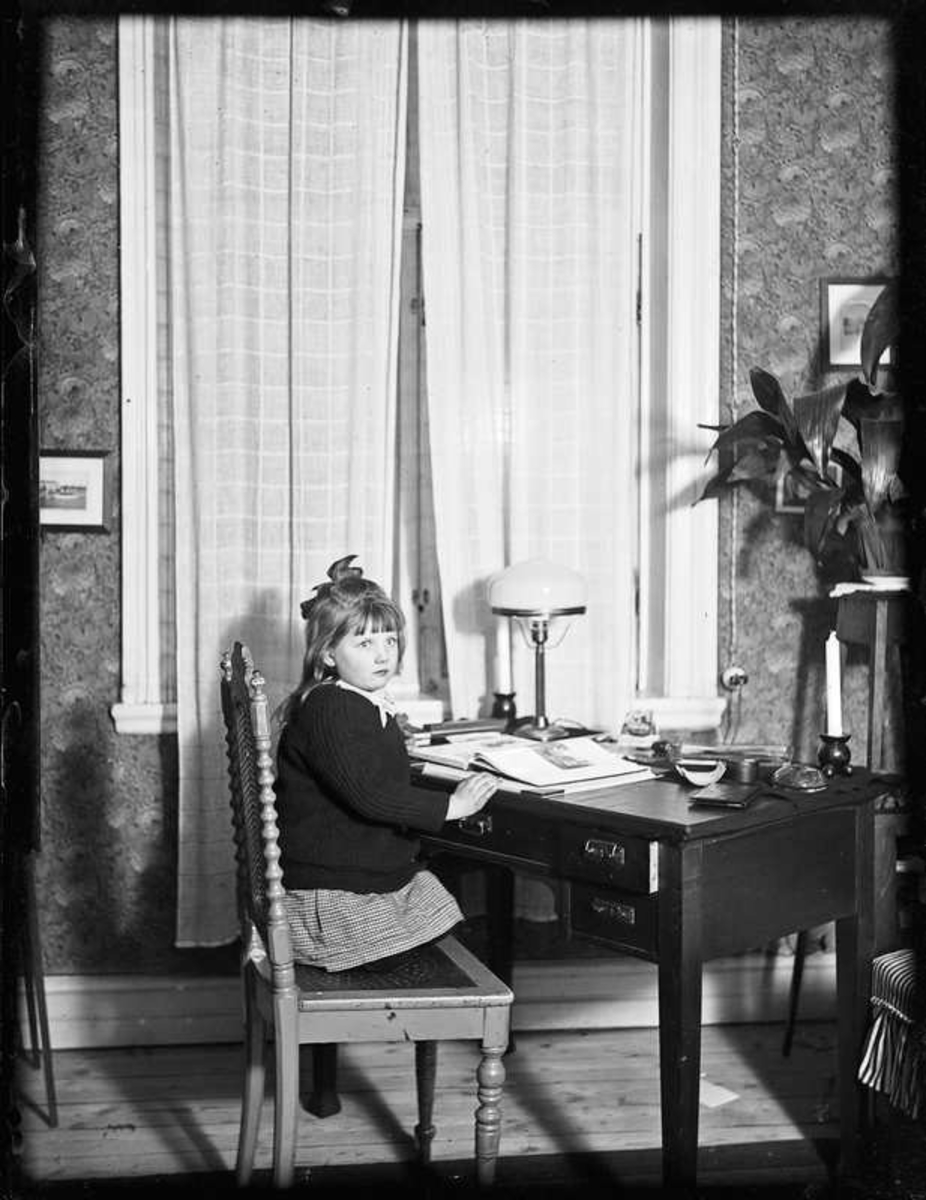 Porträtt av en liten flicka vid skrivbord.