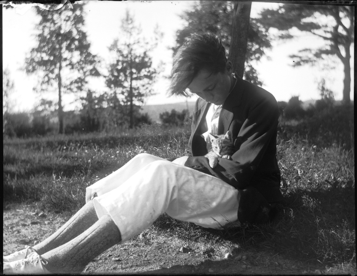 Harry Gudmundsson sittande med en kattunge i famnen.