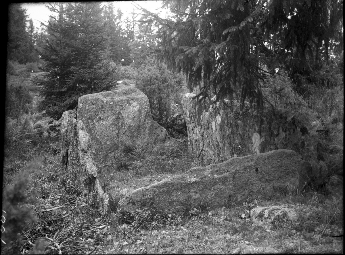 Hällkista i förgrunden (A) takhäll med skålgropar Råggärd