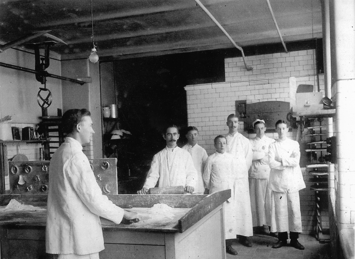 Nordfeldts konditori och bageri. Vänersborg Bageriet med bagarna, 4:e fr v Hugo Tibblin, 2:a fr h Per Nordfeldt.
