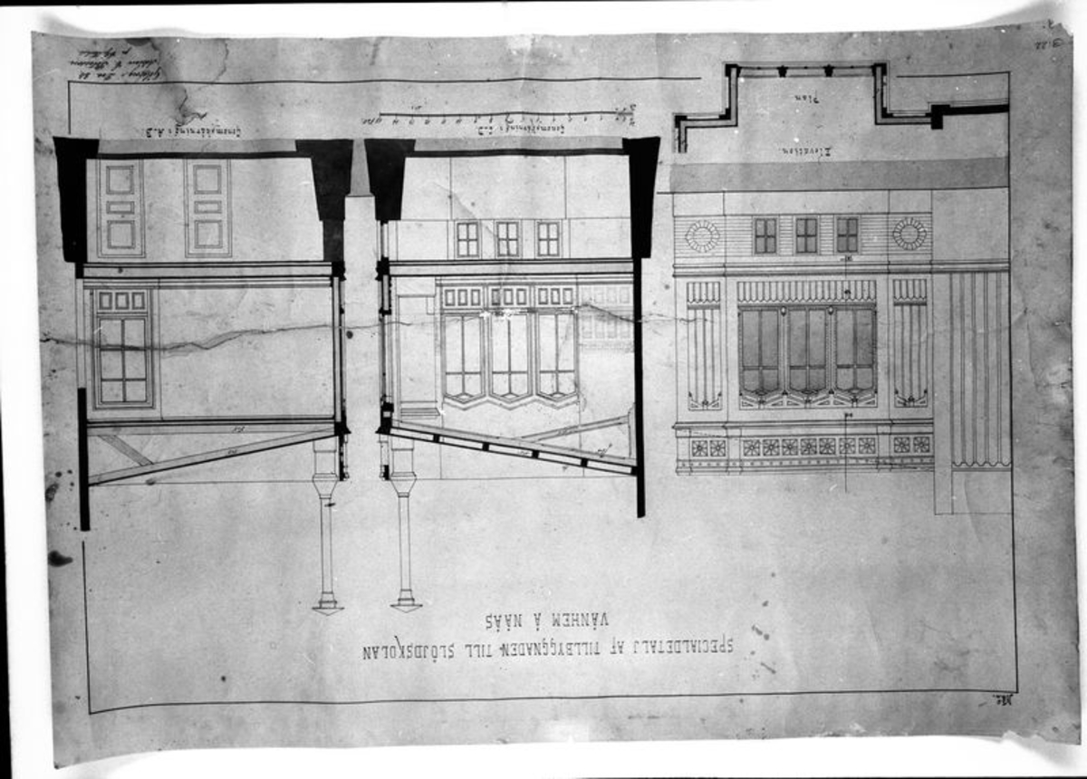 Specialdetalj av tillbyggnaden till slöjdskolan Vänhem å Nääs.