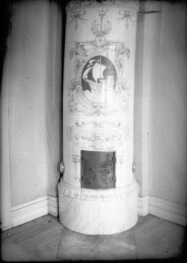Kakelugn i kakelugnsmakare Tidstrands lägenhet. Tillverkad av Tidstrand och skänkt till Vänersborgs Museum av fru Ida Henriksson 1946. Vänersborgs Museum