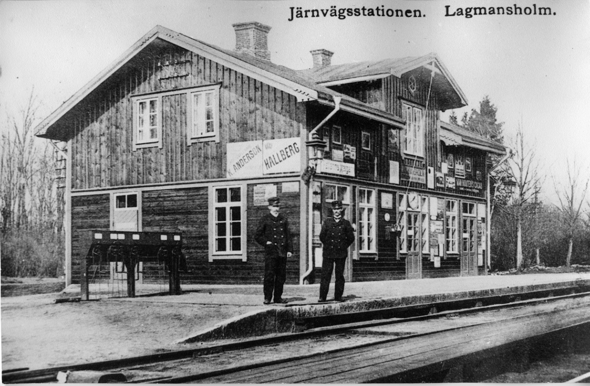 Två järnvägsarbetare vid stationshuset. Hol. Gåva från Åke Karlsson.
