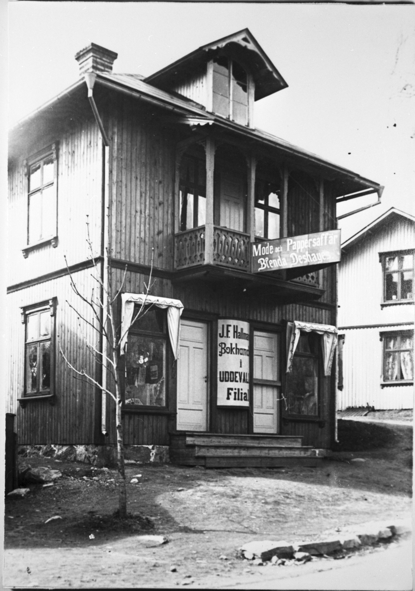 Bengtsfors. Blenda Deshayer mode och pappersaffär och J O Hallmans bokhandel i Uddevalla filial.