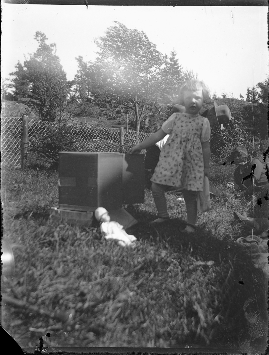 Kerstin vid sitt provisoriska dockskåp. Hennes pappa skymtar.