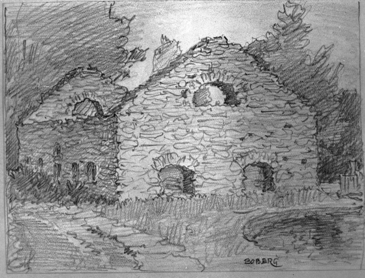 Räcksmedja Bäckefors Bäcke. Teckning av Ferdinand Boberg