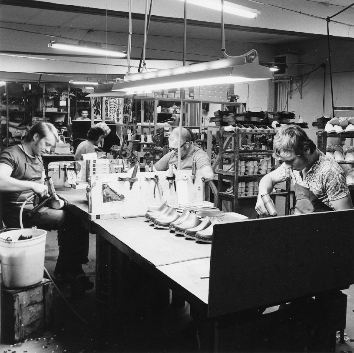 Män arbetar vid olika maskiner för skotillverkning. En stor del av produktionen består av träskor med namnet Dalbo. Holm.Se hembygden 1972, s. 156
