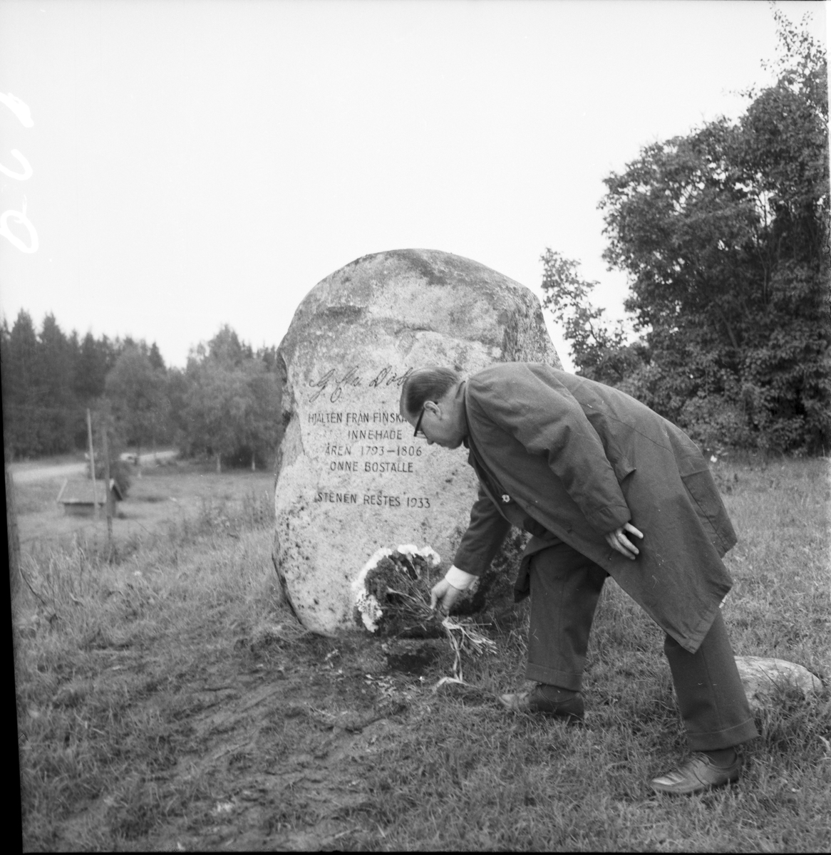 Landsantikvarien nedlägger blommor vid von Döbelns minnessten Önne Järbo