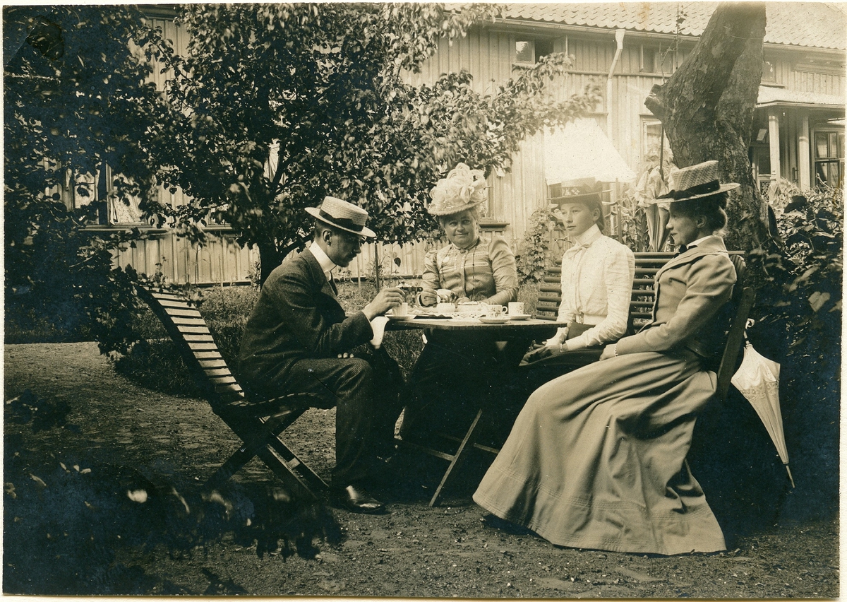 Från Emil Berggrens trädgård på Kronogatan 7 i Vänersborg [1890-talet]. Josephine Berggren, Lilly Berggren, Ellen Peterson samt okänd herre.