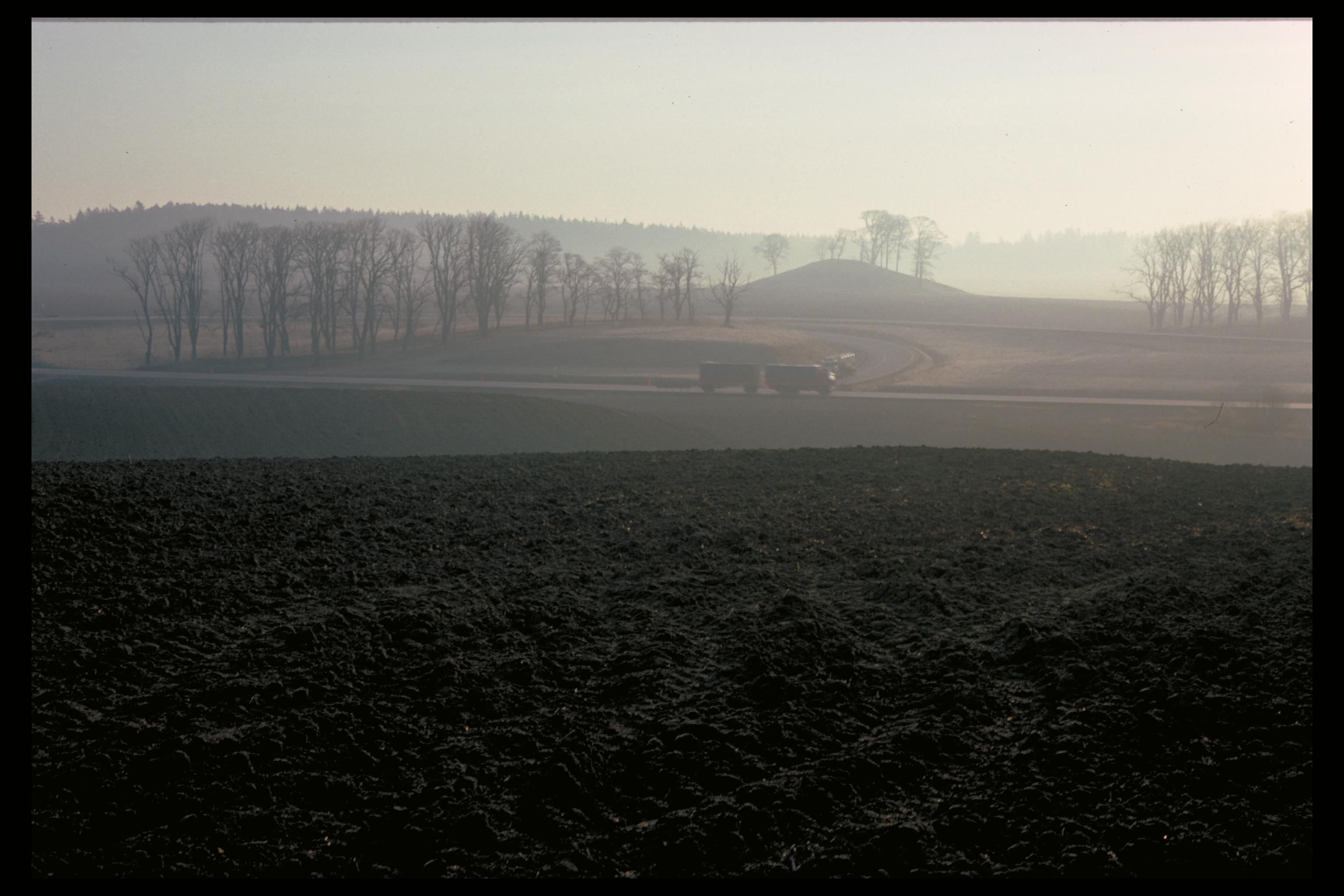 E6:an och gravhögen Ivars kulle i bakgrunden. Bilden troligen från mitten av 1970-talet.