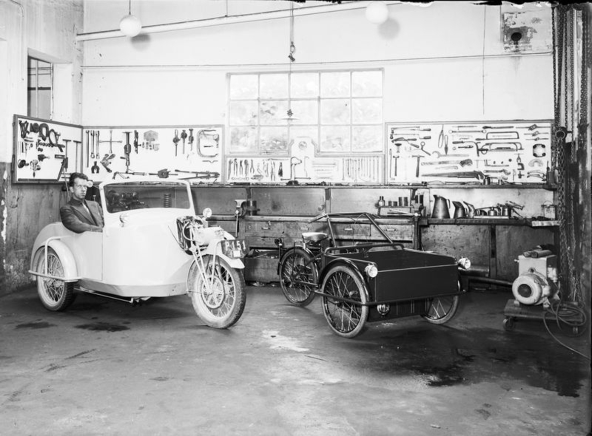 Knut Anderssons verkstäder, Hamngatan. Transportcykel och trehjulig bil. Vänersborg