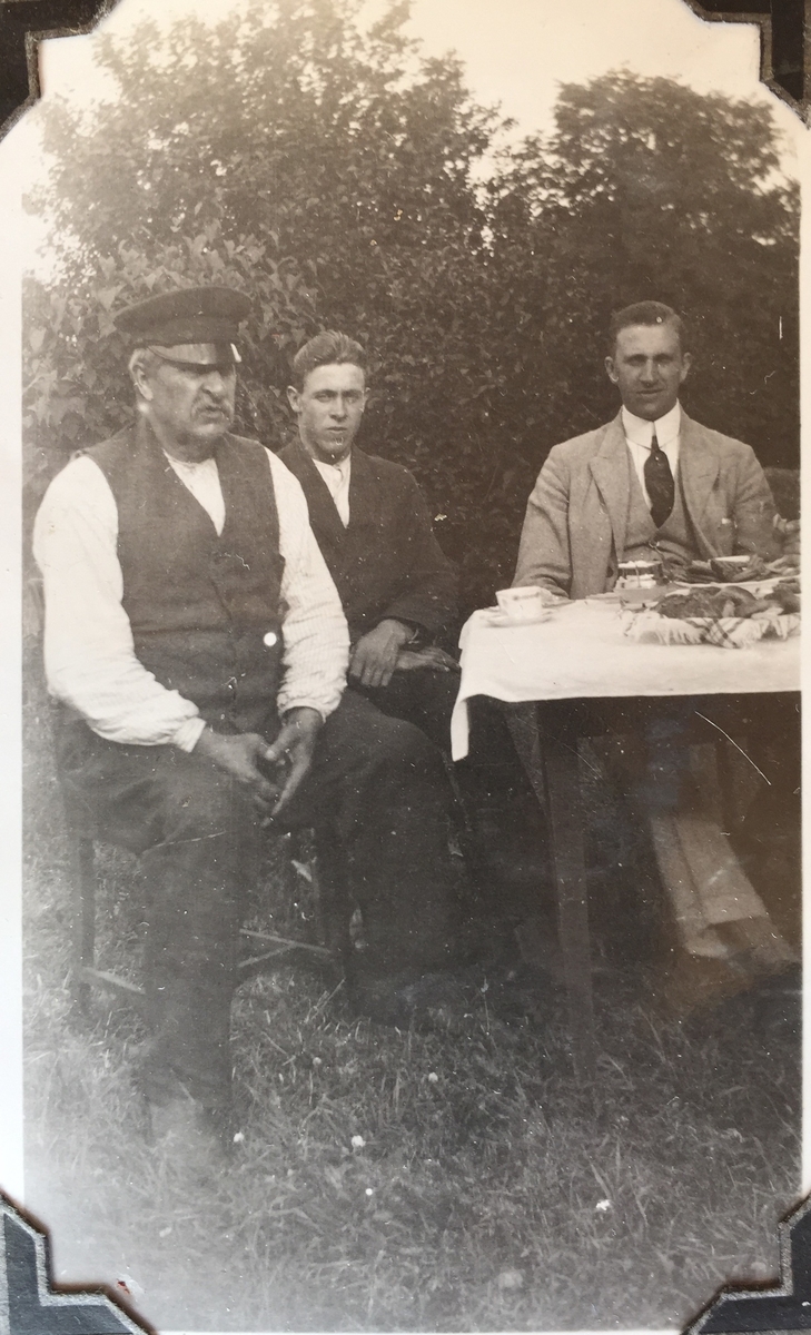 Vänersnäs. Slaktare Erik Johan Floberg dricker kaffe utomhus tillsammans med sönerna Helmer och Libert.
