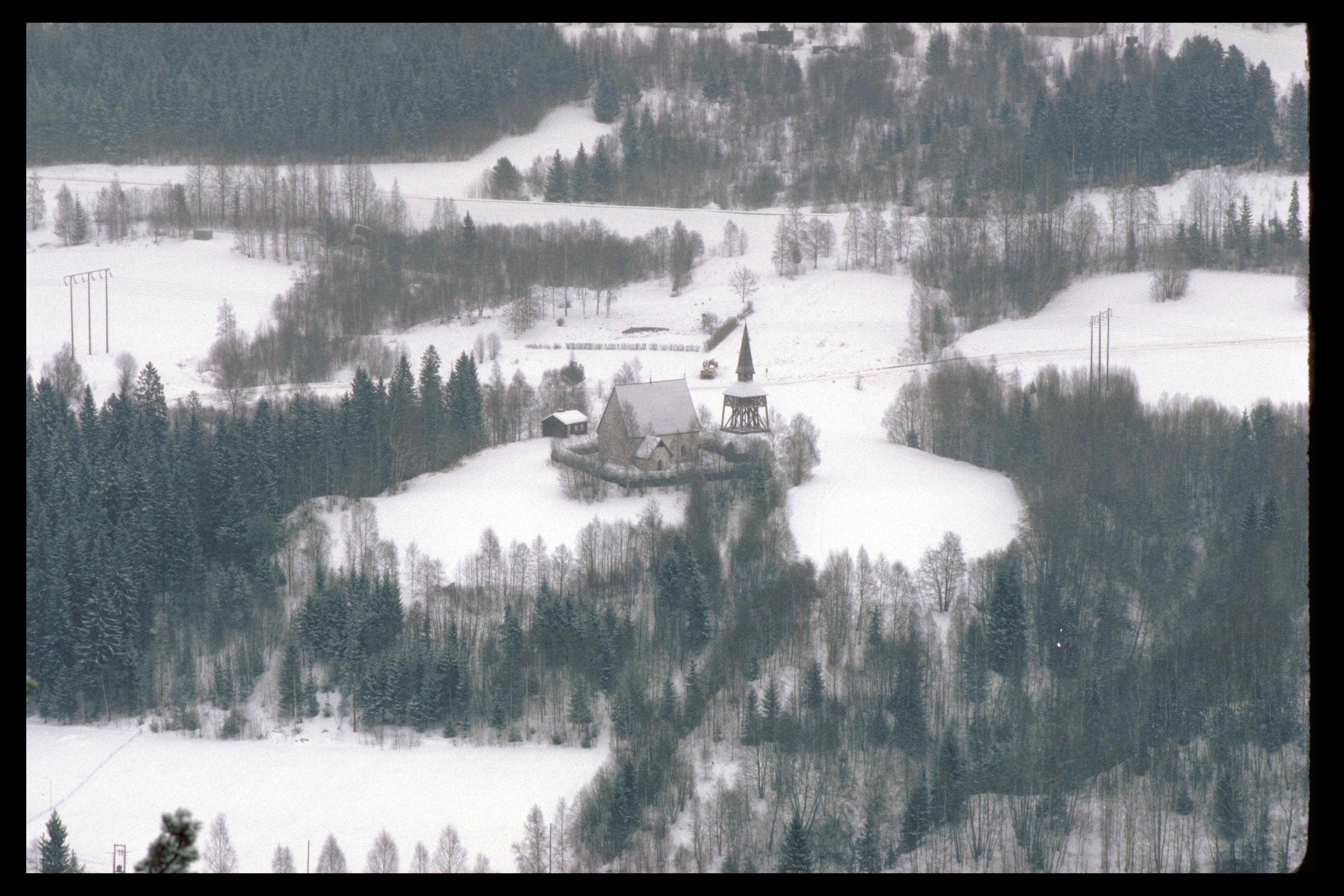 Lidens gamla kyrka i bildens mitt. Bilden troligen från början av 1980-talet.