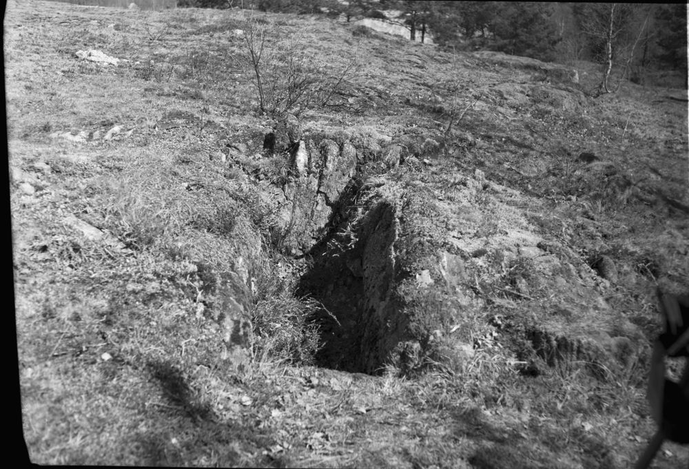 Titel: Hällkista i en naturlig urholkning i berget 2 meter lång, 65 cm bred. Järskagården, S Härene.