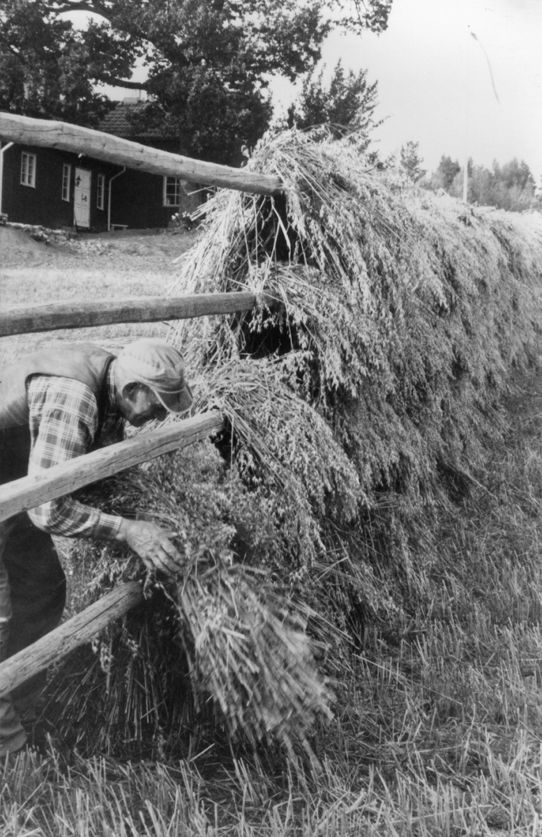 Holger i Högeryd Andersson hässjar sin havre ca 1970. Han var den siste i Tvärred socken som hässjade havren.